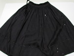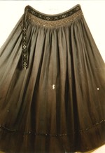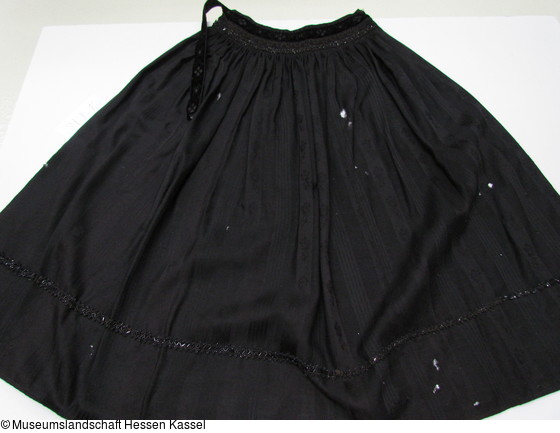 In sich gestreiftes und gemustertes Wolltuch, eine Webkante und eine Nähmaschinenkante; am Bund gefältelt und mit geometrisch gemustertem Seidensamtband (gleichzeitig Verschluß) besetzt; darunter Posamentenborte, im Saumbereich eine Reihe verschiedener Glasperlenborten.