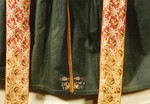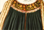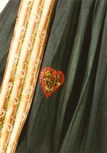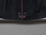 Farbe: Schürze dunkelblau; Stickerei: Rot- und Grüntöne, lachs orange, lila goldfarbene Perlen und Pailletten,Kreuz-, Platt- und Vorstich; Borten: grün, rot, weiß (Schlingenborte), hellblauer Rips mit Pikots und Fransen in gelb, rün, lila und Rottöne; Bänder: rosa mit Blütenmusterung zwischen Rankengflecht.