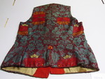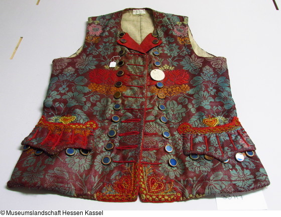 Weinroter Damast, durchwirkt mit türkisblauen, roten und gelbem Blumenmuster, Revers und mit Glasknöpfen verzierte Taschen; Rückenteil aus vier Teilen gefertigt; rot-gelbe Stickerei über den Taschen, an den Ecken und am Rückenteil (Tulpe aus einem Herz wachsend).