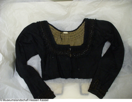 Schwarzer, feiner Rips mit eingewebten Sreublumen; angesetzter Bund; Ausschnitt mit schwarzem Falbel, Falbel mit schwarzen Posamenten und Perlstickerei verziert; Ärmelbund mit schwarzer Perlstickerei, Posamenten und Samtborte besetzt sowie mit schwarzem Seidenband eingefaßt;