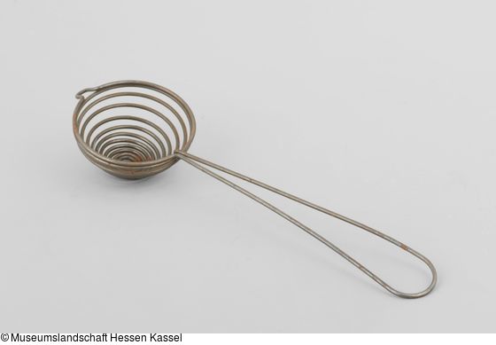Kleines Sieb aus Drahtgeflecht, runde tiefe Laffe mit kleiner Öse zum Aufhängen. Griff aus Draht in langgezogener Tropfenform.