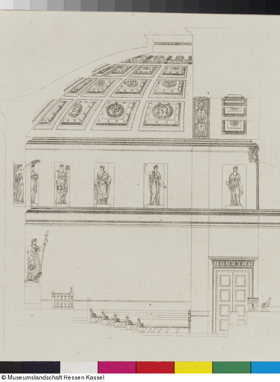 Bezeichnung: Querschnitt durch den Ständesaal, aus: Plan, coupe, élévation et détails de la restauration du palais des états et de sa nouvelle salle à Cassel, 1810, Blatt IV