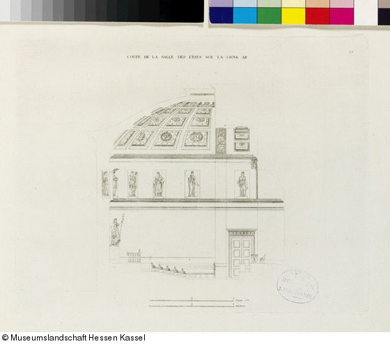 Querschnitt durch den Ständesaal, aus: Plan, coupe, élévation et détails de la restauration du palais des états et de sa nouvelle salle à Cassel, 1810, Blatt IV