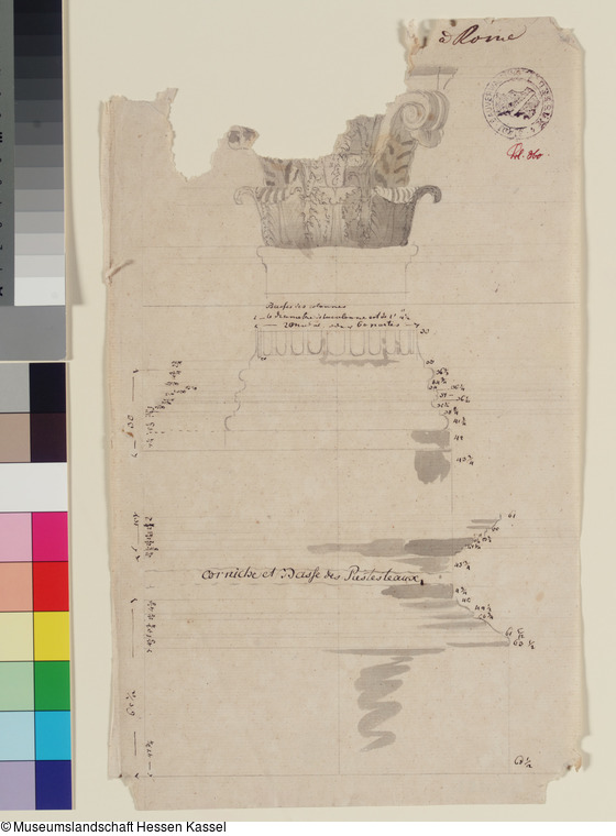 Beschriftungen: in der Darstellung: "[...] à Rome", "Bases des colonnes", "Corniche et Bases des Piestesteaux" (mit Feder in Braun);