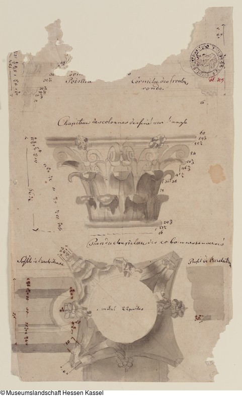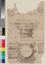 Beschriftungen: in der Darstellung: "Corniche des frontons ronds.", "Chapiteau des colonnes definé sur l'angle", "Plan du chapitau des colonnes renversés", "Soffite de l'architrave", "Profil de l'architrave" (mit Feder in Braun);