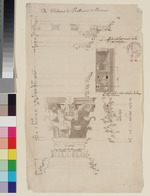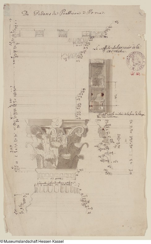 Beschriftungen: oben mittig und in der Darstellung: "Du Dedans du Pantheon à Rome.", "Le soffite du larmier de la corniche.", "Profil parte milieu de la face du Chapiteau des Collones." (mit Feder in Braun);
