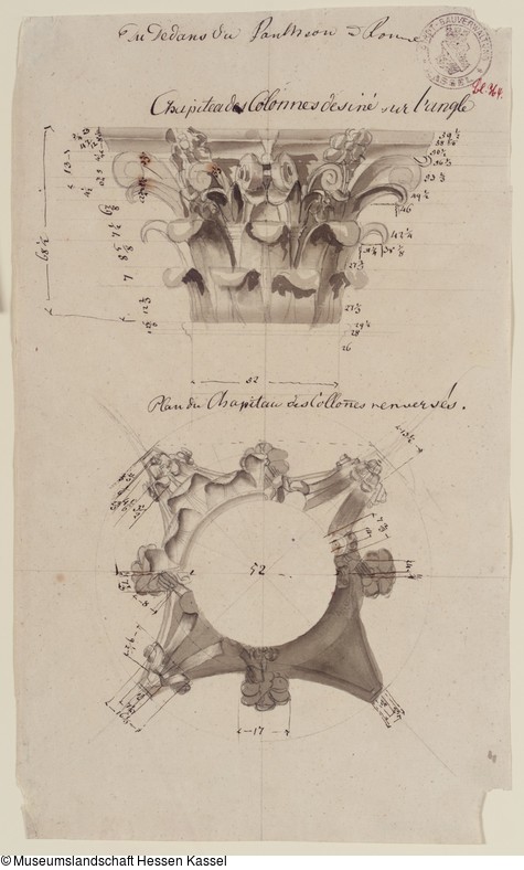in der Darstellung: "En Dedans du Pantheon à Rome", "Chapiteau des Colonnes desiné sur l'angle", "Plan Chapitau des Collones renversés." (mit Feder in Braun); oben rechts: "Bl. 364." (mit Feder in Rot); in der Darstellung: (mit Feder in Braun);
