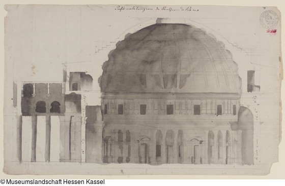 oben mittig: "Profil sur la longueur du Pantheon à Rome" (mit Feder in Braun); oben rechts: "Bl. 355." (mit Feder in Rot); in der Darstellung: (mit Feder in Braun);