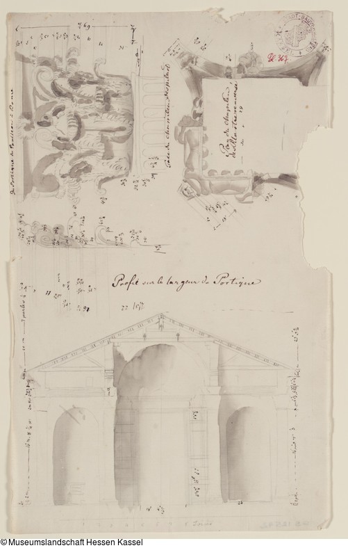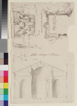 Beschriftungen: in der Darstellung: "Du Portique du Pantheon à Rome", "Face du chapiteau des pilast(re)", "Plan du chapiteau des Pilastre renvensé", Profil sur la largeur du Portique" (mit Feder in Braun);