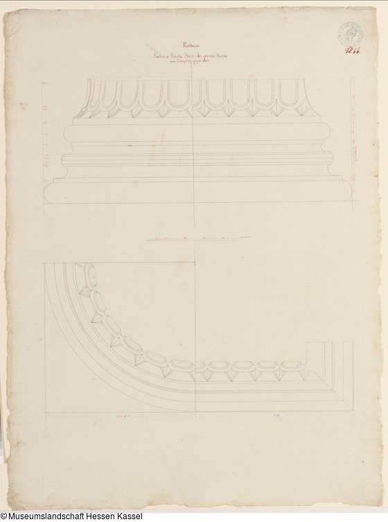 oben mittig: "Pantheon: Säule u. Pilaster Basis der grossen Nische. / am Eingang gegenüber." (mit Feder in Rot); oben rechts: "Bl. 66." (mit Feder in Rot);